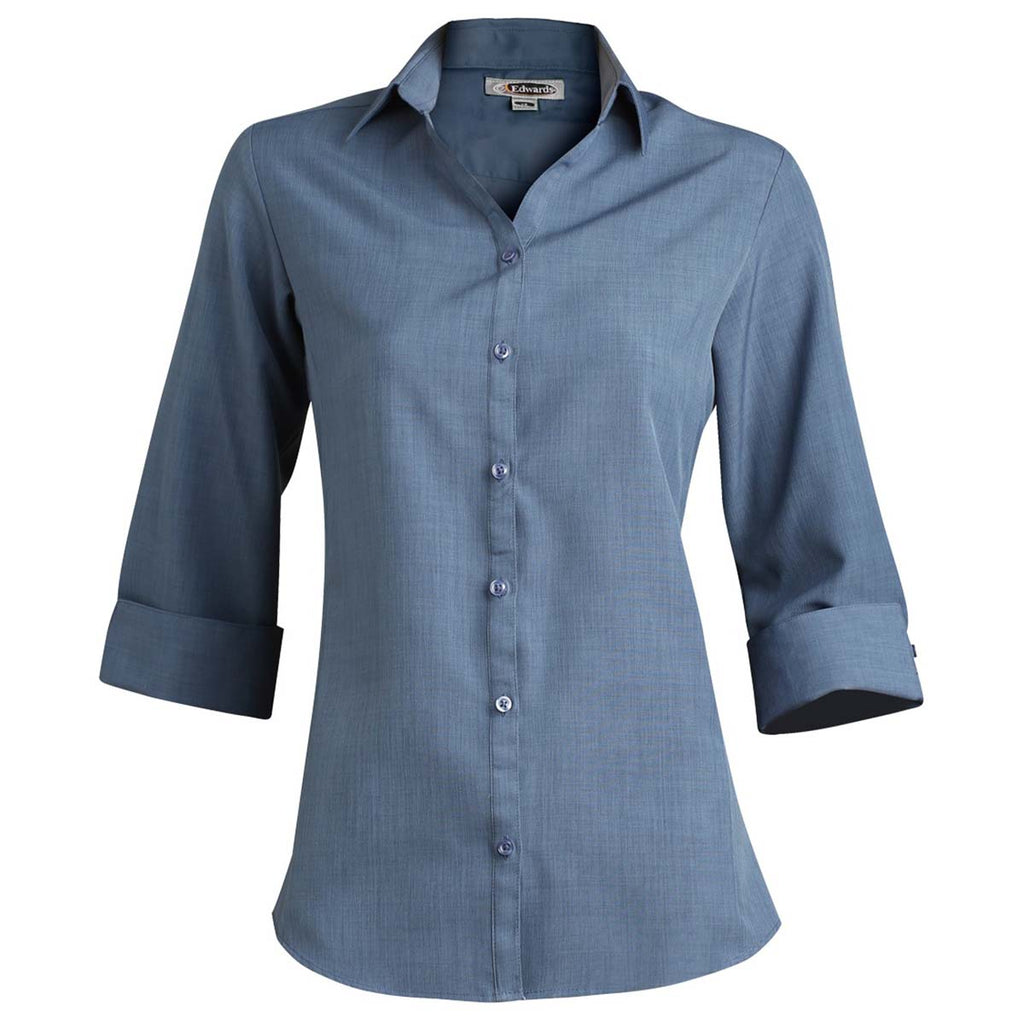 Create a custom tailored look with the Edwards Women's Riviera Blue Batiste 3/4 Sleeve Shirt made of 100% polyester. The sophistication found in this blouse is unmatched with 3/4 sleeves with notch details and button closure. Add your corporate embroidery to this beautiful blouse and use as employee apparel or hospitality apparel for larger events. Your company logo will stand out against several color options on this wrinkle resistant, soil release, moisture wicking, easily laundered uniform blouse that will stand the test of time. Place an order today to have a professional look for your opening or next event.Highlights