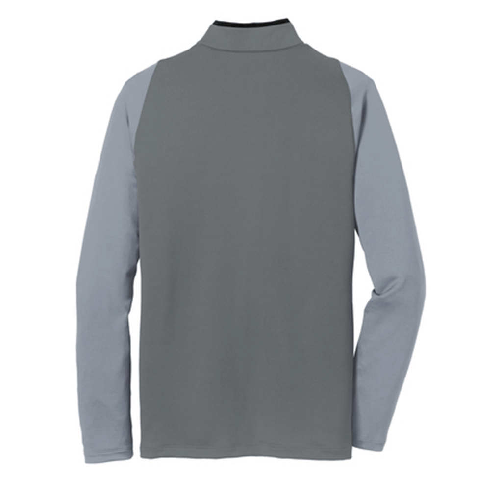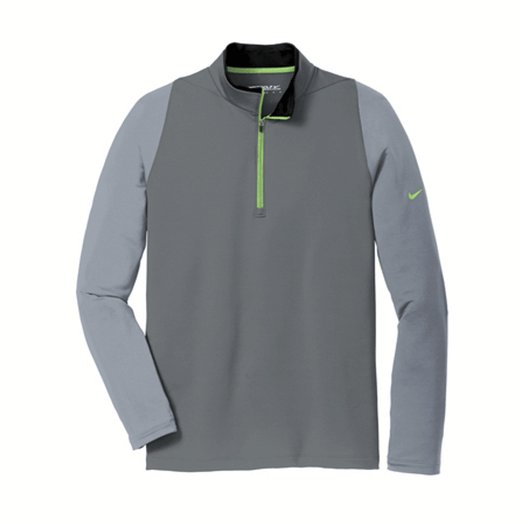 Say hello to your new favorite clothing item: the Nike Men's Dark Grey/Cool Grey/ Volt Dri-FIT Stretch 1/2-Zip. Just as comfortable on the golf course as it is in the office, this is a corporate Nike style that is clean, modern, and purposely built for your custom logo. So why does it have "stretch" in the title? It is made of a 93/7 polyester/spandex Dri-FIT fabric with just the perfect amount of stretch for movement at the driving range or in the conference room. The Dri-FIT moisture-wicking technology will keep you cool and dry, and the contrast collar and zipper, open cuffs and open hem will keep you looking great. With the trademark Swoosh on the sleeve, that means you've got a wide open left chest for your company logo. Like we said: your new favorite clothing item.