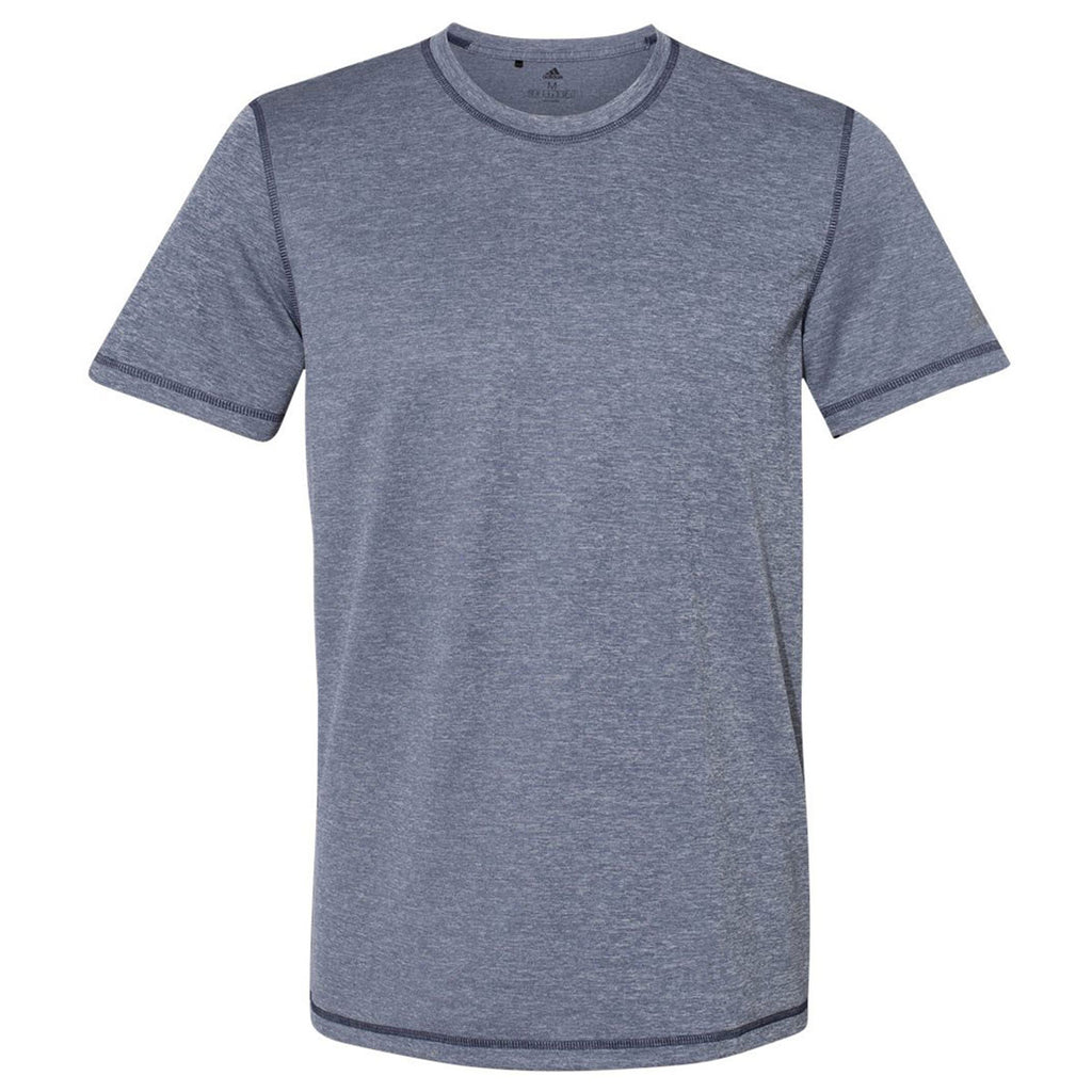 Stay comfortable and look great in a screen print Adidas Men's Collegiate Navy Heather Sport T-Shirt. Ideal for the gym, a day with the family, or a quick round of golf, this 100% recycled polyester pique tee is good for the environment and great for you with UPF 50+ protection. Add a company logo to use these as employee apparel that will stand up to hard work or a corporate logo to use for corporate events as a way to showcase your company or organization. The crewneck design with open hem sleeve is designed for all day comfort whether worn alone or layered for warmth.