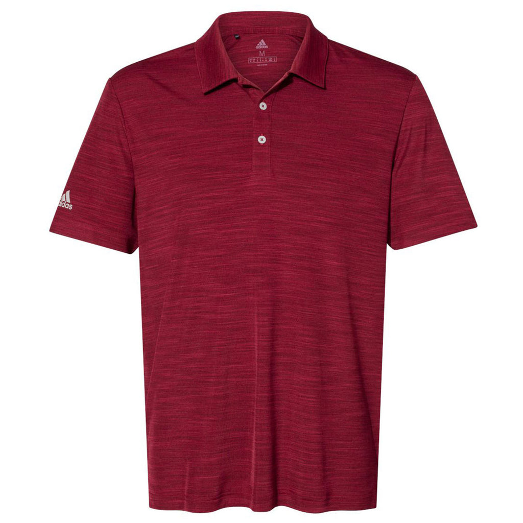 Play the back nine in an embroidery Adidas Men's Collegiate Burgundy Melange Sport Polo. Made of environmentally friendly 100% recycled polyester with striated heather interlock in a lightweight feel, this sport shirt will stand up to hard work, play, or fun. Add a company logo to use these as employee apparel or gifts that will be put to use immediately. The self-fabric collar, three button placket, and open hem sleeves and bottom hem offer a perfect business friendly look when paired with a jacket. Use as corporate apparel with a custom logo to stand out and get noticed or simply enhance your personal wardrobe.