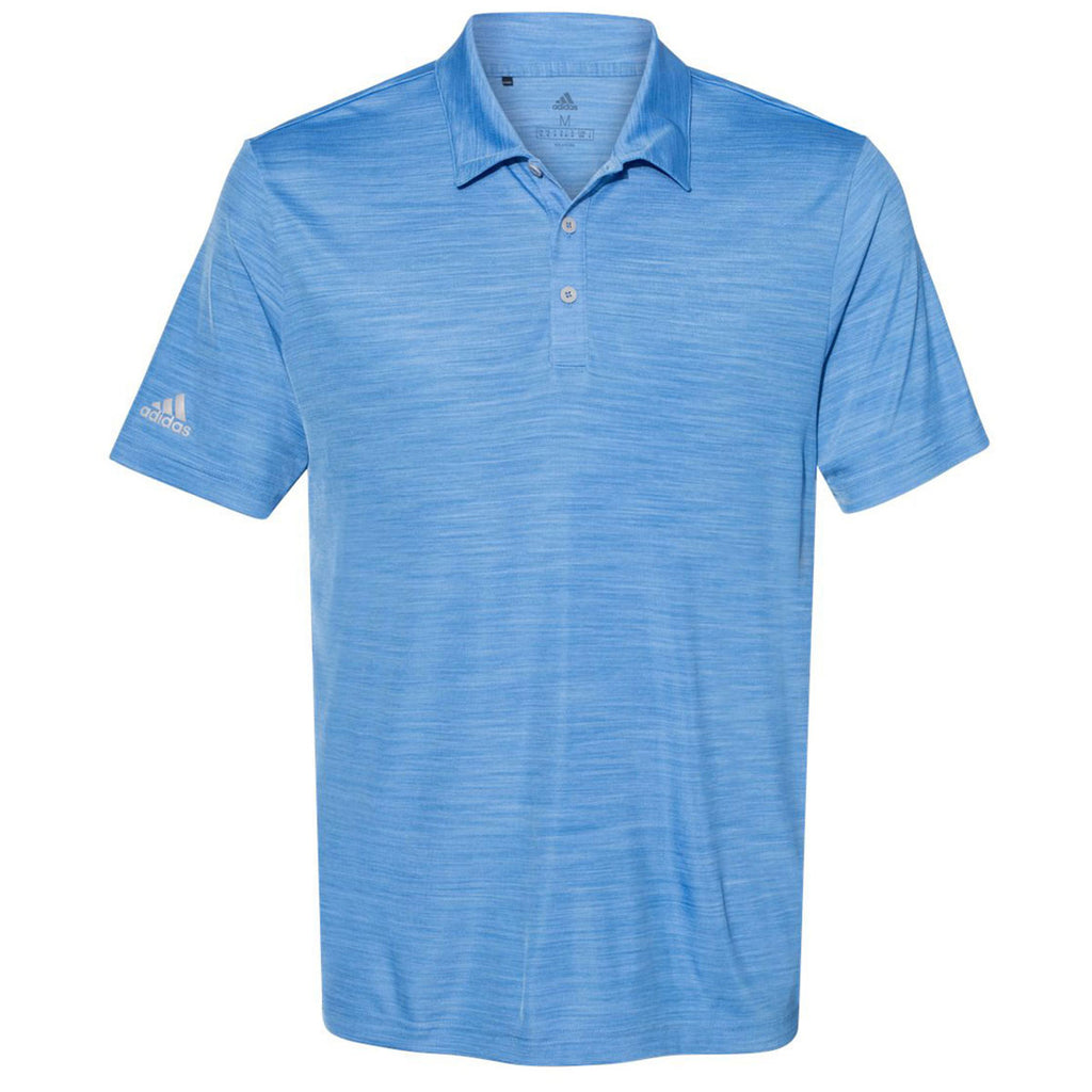 Play the back nine in an embroidery Adidas Men's Lucky Blue Melange Sport Polo. Made of environmentally friendly 100% recycled polyester with striated heather interlock in a lightweight feel, this sport shirt will stand up to hard work, play, or fun. Add a company logo to use these as employee apparel or gifts that will be put to use immediately. The self-fabric collar, three button placket, and open hem sleeves and bottom hem offer a perfect business friendly look when paired with a jacket. Use as corporate apparel with a custom logo to stand out and get noticed or simply enhance your personal wardrobe.
