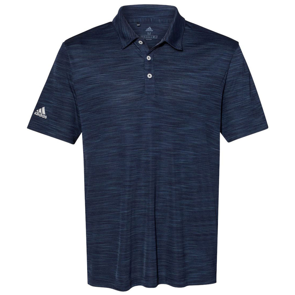 Play the back nine in an embroidery Adidas Men's Collegiate Navy Melange Sport Polo. Made of environmentally friendly 100% recycled polyester with striated heather interlock in a lightweight feel, this sport shirt will stand up to hard work, play, or fun. Add a company logo to use these as employee apparel or gifts that will be put to use immediately. The self-fabric collar, three button placket, and open hem sleeves and bottom hem offer a perfect business friendly look when paired with a jacket. Use as corporate apparel with a custom logo to stand out and get noticed or simply enhance your personal wardrobe.