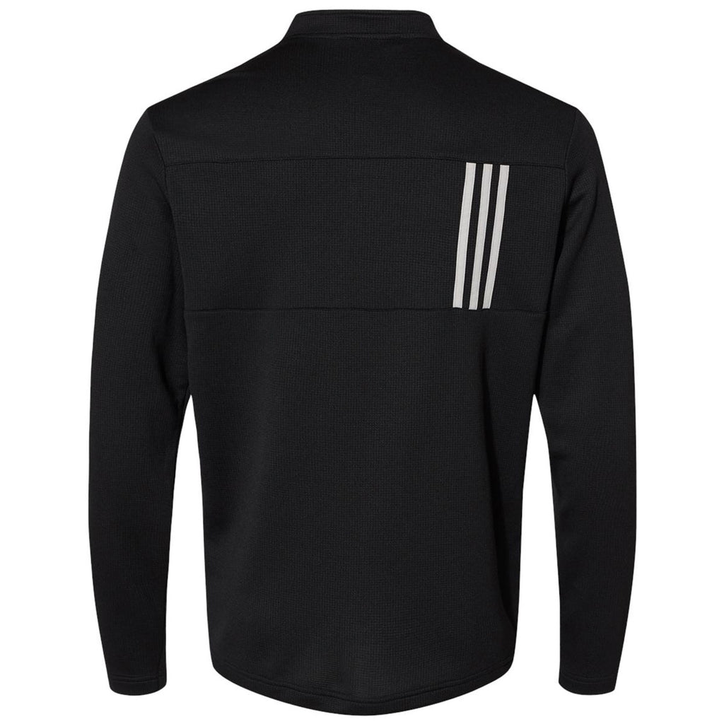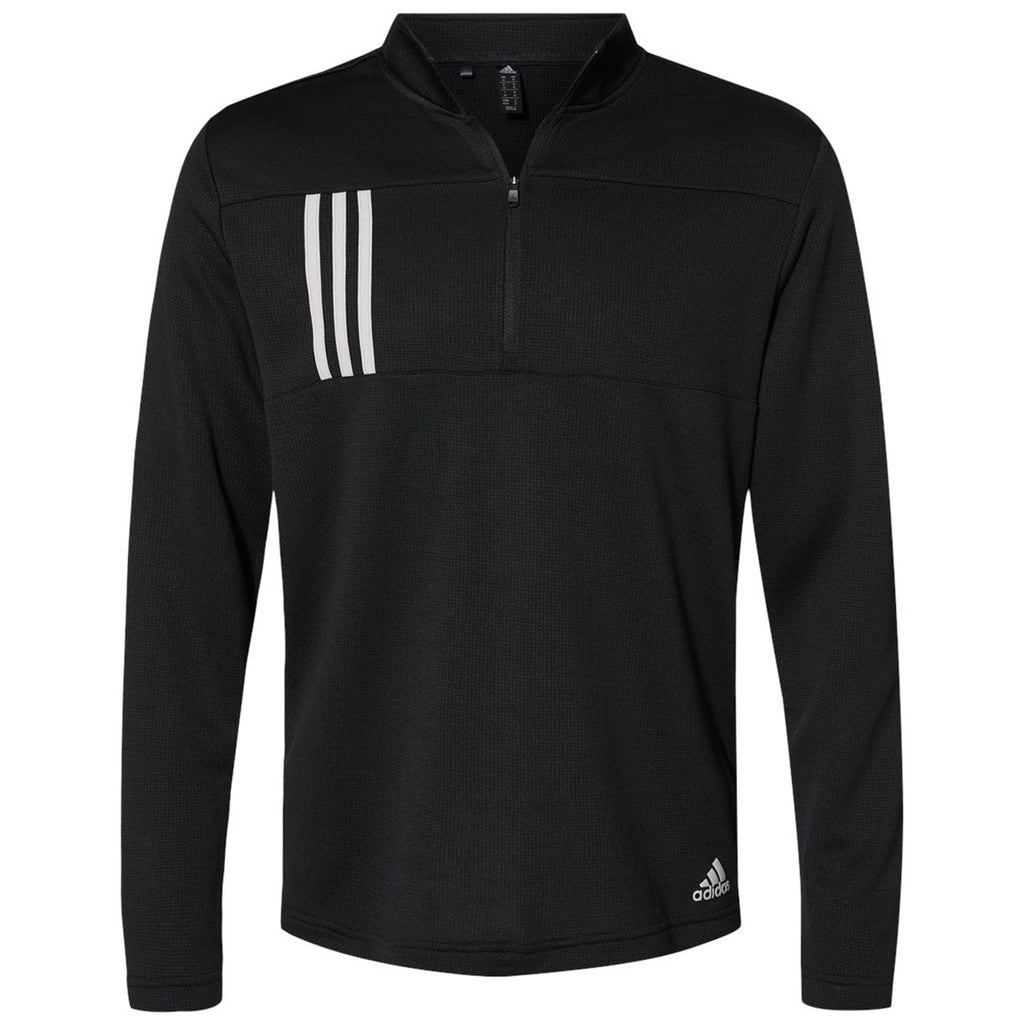 Add embroidery to the Adidas Men's Black/Grey Two 3-Stripes Double Knit Quarter-Zip Pullover to create a wonderful look that can easily go from the boardroom to the breakroom. This 100% recycled polyester, waffle textured knit has a mock collar that can be worn over a long sleeve tee or button-up with ease. Add a company logo to use these as employee apparel or even part of a uniform for all workers. A custom logo creates a wonderful gift on this pullover that has moisture management properties and open hem sleeves. The 3 bold stripes on the right chest add flair to the overall look and appeal.