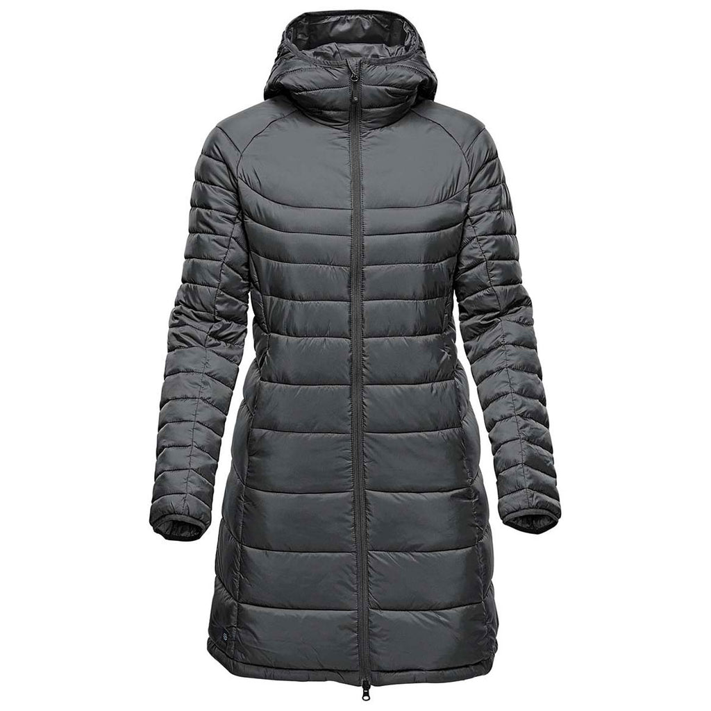 Add embroidery to the Stormtech Women's Graphite/Graphite Labrador Parka for an upscale look that is great for the corporate setting or everyday life. The gorgeous quilting on the longer length jacket is perfect for heat retention and a hood with storm flap keeps you protected. The water-resistant outer shell is great for cold, wet weather and outdoor adventure. Order yours today.Highlights