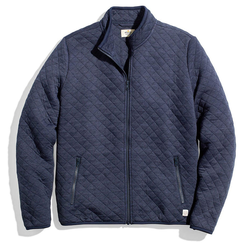 A slightly vintage-inspired sense of style makes the Marine Layer Men's Navy Heather Corbet Full Zip Jacket a must-have for brands who want to keep their team on the cutting edge of current trends. Create a uniform look by adding your company's custom logo or design to this stylish quilted full-zip jacket.