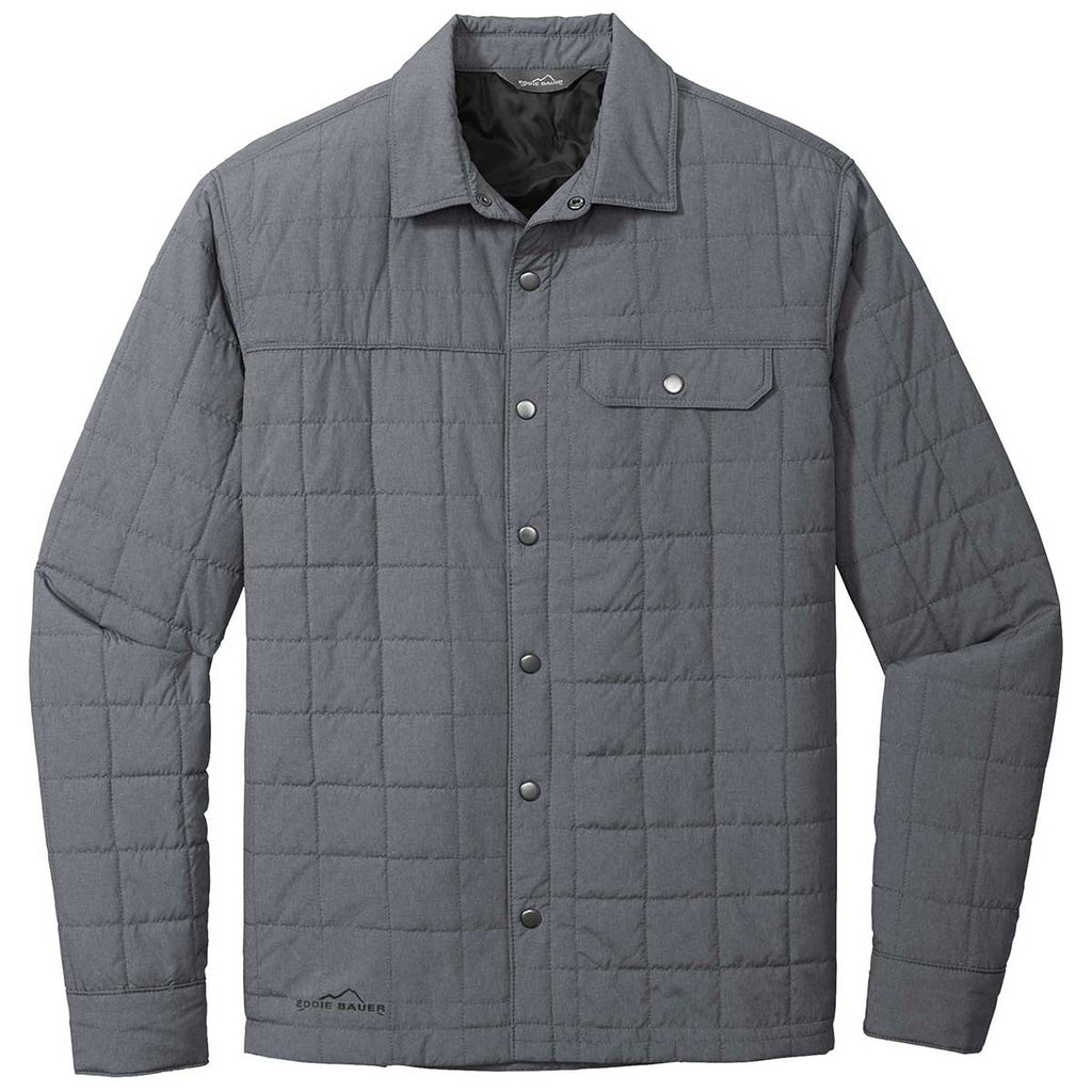 Make a statement in a custom embroidered Eddie Bauer Men's Charcoal Grey Heather Shirt Jacket made of 100% polyester fabric and fill. The midweight jacket is comfortable enough for daily wear, but stylish enough for a corporate event or retreat. Add a company logo or corporate emblem to use this jacket as part of company uniforms or as employee gifts. Complete with a snap front closure and snap cuffs, this jacket is well fitted and water resistant with a PU coating. The drop in left chest pocket will keep small items at hand as you go about your day.