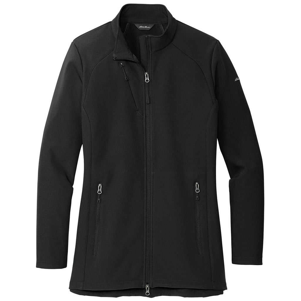 The Eddie Bauer Women's Deep Black Stretch Soft Shell Jacket is a great all-weather jacket. Keep warm with soft fleece lining on a chilling day. The polyester/spandex material blend provides ease of movement for the active day. Create a custom jacket by adding a logo on the chest and broadly display any brand.