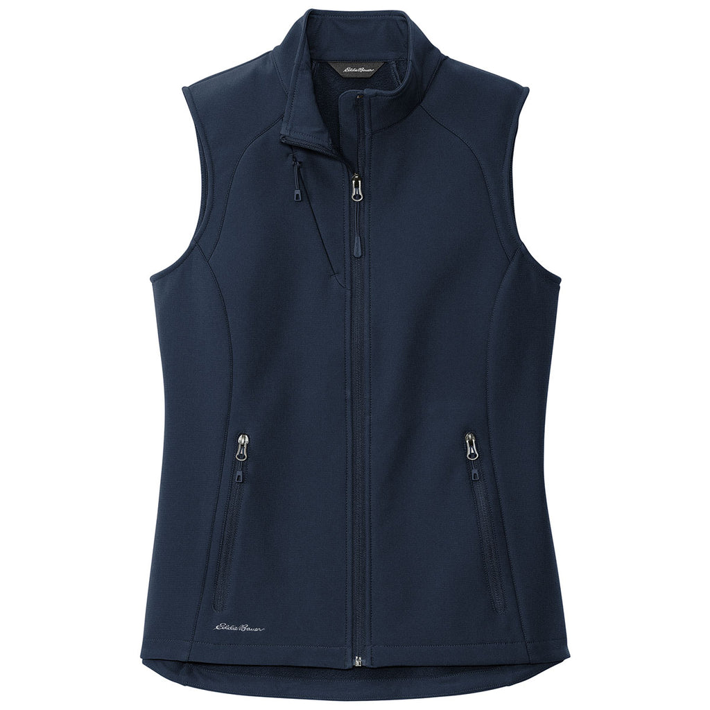Order the Eddie Bauer Women's River Blue Navy Stretch Soft Shell Vest for extra warmth on a chilly night. Easily layer with any dress shirt for a professional corporate look. Fleece lining for a soft and comfortable fall day. Add a custom logo and broadly display your company's brand.