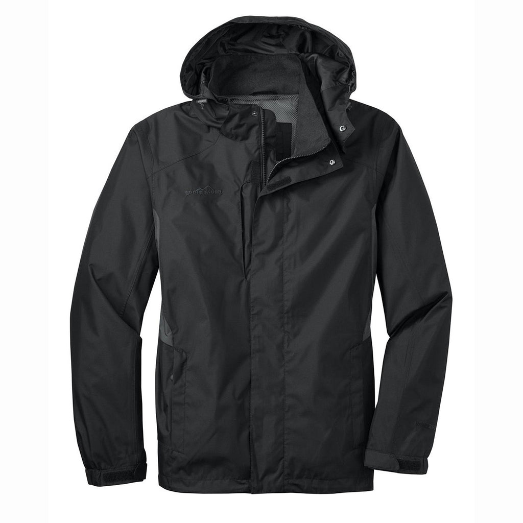Serious people don't let a little rain stop them from getting work done. The Eddie Bauer Men's Black/Steel Grey Rain Jacket is a serious rain jacket for those same serious people. The 5000MM waterproof rating ensures that you'll keep the moisture locked out of your upper body. The storm flap with hook and loop closures will ensure that the jacket's own openings won't let the rain in, either. The 100% polyester dobby shell, the mesh body lining, and the 100% nylon accents are all perfect rain-ready gear; all that's missing is your own company logo on the front.
