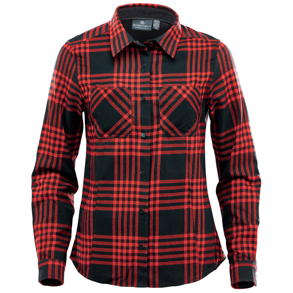 Embroidery will pop on the Stormtech Women's Red/ Black Santa Fe Long Sleeve Shirt. The vibrant color palette chosen for this shirt is an updated take on the traditional plaid shirt. The unforced finish is an urban outdoor staple whether making a weekly trip to the farmer's market or heading out with friends for an early morning hike. Add a custom logo to give as gifts or a company logo to use as part of employee apparel. A truly cultured look with snap closures along the front and snap closure pockets, this urban essential is a must have.Corresponding Men's Style:Stormtech Men's Red/ Black Santa Fe Long Sleeve Shirt