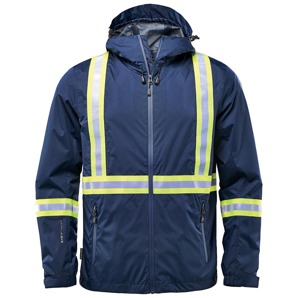 When safety is of the utmost importance, you'll want your team to be wearing a Stormtech Men's Navy Olympia Reflective Shell that features your company's custom logo or design. Made from a H2XTREME PFC-Free waterproof/breathable fabric, this lightweight layering piece includes high visibility reflective taping for added visibility when on the jobsite.