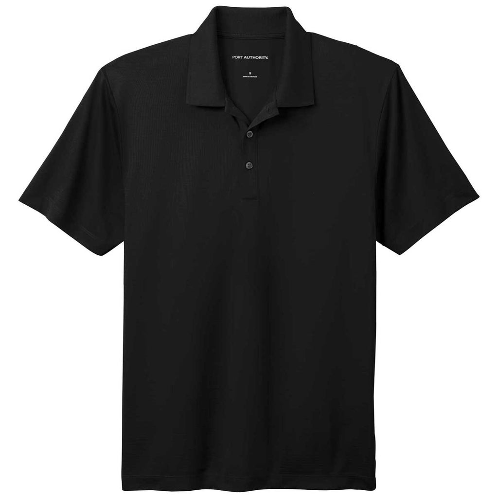 Appreciate a custom look with the Port Authority Men's Deep Black Eclipse Stretch Polo. this straightforward, polished polo is a must have for most wardrobes. The subtle striped pattern creates a perfect canvas for your custom logo and the polyester rich spandex jersey blend is snag resistant and moisture wicking. Add a company logo to use as employee apparel that will look and feel great throughout the day and is easily cleaned for repeat wear. A simple 3-button placket and flat knit collar tie the look together in a classic, yet updated way.Corresponding Women's Style: Port Authority Women's Deep Black Eclipse Stretch Polo