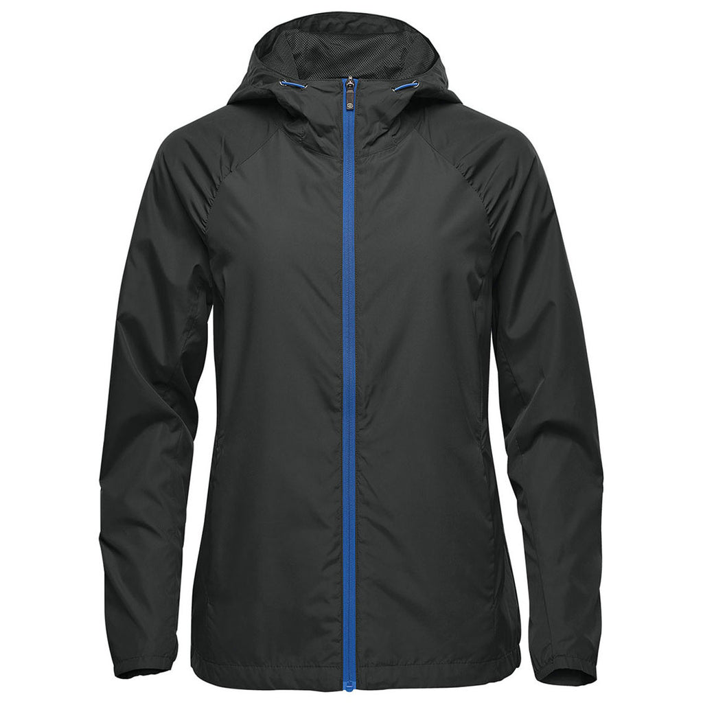 A custom embroidery on the Stormtech Women's Black/Classic Blue Pacifica Jacket will create a custom gift that others will truly appreciate. This full front zip jacket is urban inspired and outdoor ready. The ultra-lightweight wind jacket provides a sleek, somewhat fitted silhouette with back mesh lined vent to keep you comfortable. Articulated elbows allow for freedom of movement and an attached hood keeps you protected during pop-up showers. The beautiful jacket has a simplistic design, but is perfect for a range of situations. Add a company logo to use as part of employee uniforms for those who have to work outdoors, but need to be able to move freely. Place an order today for these versatile jackets.Highlights