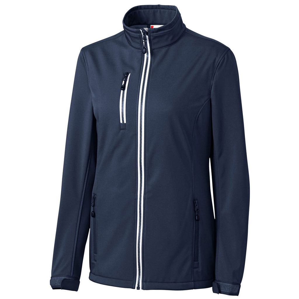 Raise the fashion bar for company apparel by ordering the Clique Women's Dark Navy Telemark Softshell for the members of your hard working team. The ultimate jacket for employees working in the field includes a mock neck and Velcro closure cuffs that produce a unique style befitting your dedicated staff. The 96% polyester softshell jacket contains a bit of spandex to increase your mobility. Rugged polyester resists the types of rips and tears that end the fashion usefulness of other active wear jackets. Add your corporate on the large embroidery area to gain more loyal customers.Corresponding Men's Style: Clique Men's Dark Navy Telemark Softshell