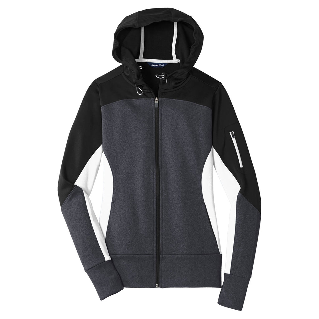 Contrast coloring and a smooth matte finish highlight the design features of the Sport-Tek Women's Black/Graphite Heather/White Tech Fleece Colorblock Full-Zip Hooded Jacket. The double knit jacket resists snags and pilling. One-hundred percent highly breathable polyester ensures you remain comfortable throughout a long hike. Princess seams and integrated front pockets offer the double benefits of sleek design and long lasting performance. The front pockets allow you quick access to electronic devices. Attach a custom logo on the jacket to put your brand in front of potential customers. Place your hands in the thumbholes to keep your hands warm.Highlights