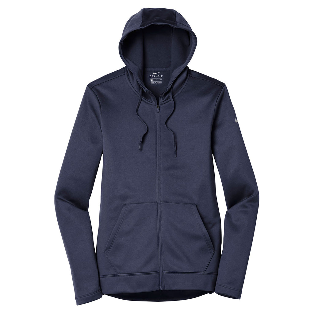 Designed to include proprietary Therma-FIT technology, the custom logoed Nike Women's Midnight Navy Therma-FIT Full-Zip Fleece Hoodie traps body heat to ensure you enjoy supreme comfort all day whenever the temperature dips below freezing. Moisture management properties ensure the skin remains comfortably dry. Rugged 100% polyester resists rips and tears to make the fleece hoodie ideal for outdoor enthusiasts. Kangaroo pockets warm the hands, as well as conveniently store small electronic devices. Attach your corporate logo to broaden your company's reach in the community. With logoed apparel, you create a cost effective way to sell your brand image.