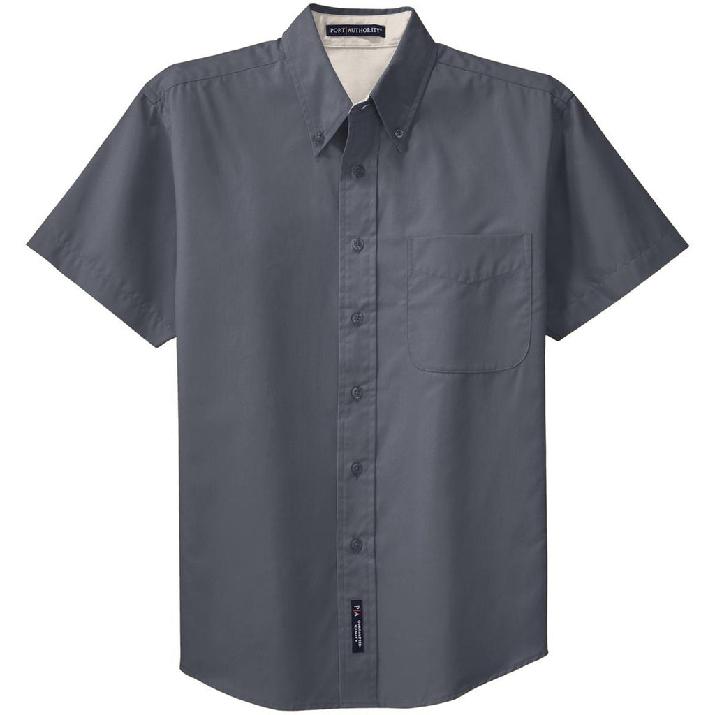 A short-sleeve button-down made for the workday but professional enough for upscale events? No, you're not dreaming: that's actually an apt description for Port Authority Men's Steel Grey/Light Stone Short Sleeve Easy Care Shirt. The 4.5-ounce, 55/45 cotton/poly blend fabric is perfect for breathing, while the button-down collar ensures that your employees will always be event-appropriate. The patch pocket scores points for function as well as dressiness, and the dyed-to-match buttons are as subtle as they are necessary. And if you ask us, a good work shirt should be understated, allowing your own corporate embroidery and custom business logo to earn the attention.Corresponding Women's Style: Port Authority Women's Steel Grey/Light Stone Short Sleeve Easy Care Shirt