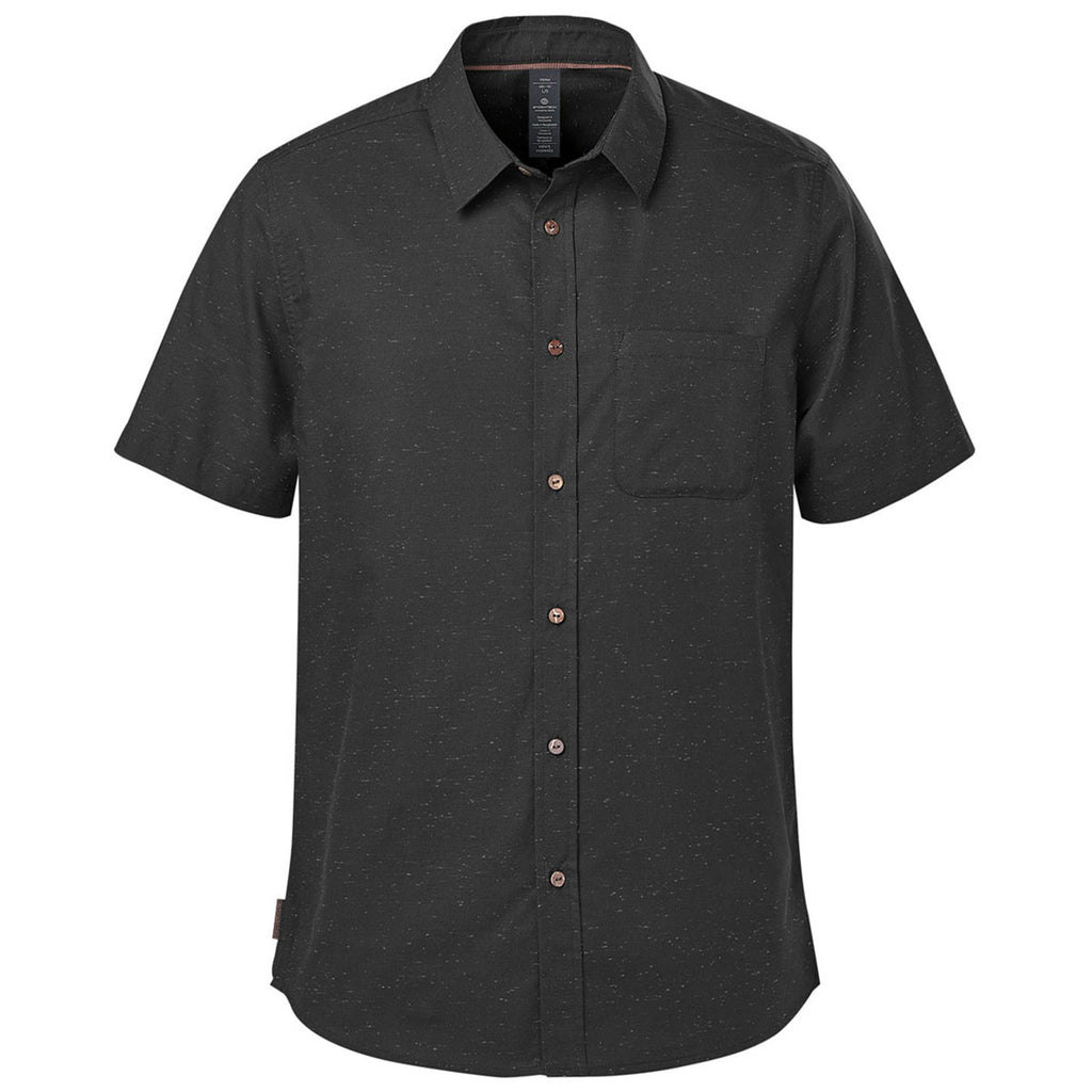 Your company's custom logo or design will always take center stage when it's added to the Stormtech Men's Black/Carbon Skeena Short Sleeve Shirt. Clean lines and a heathered slub fabric make this an elevated take on a classic short-sleeved button down. Coconut buttons add a stylish finishing touch.