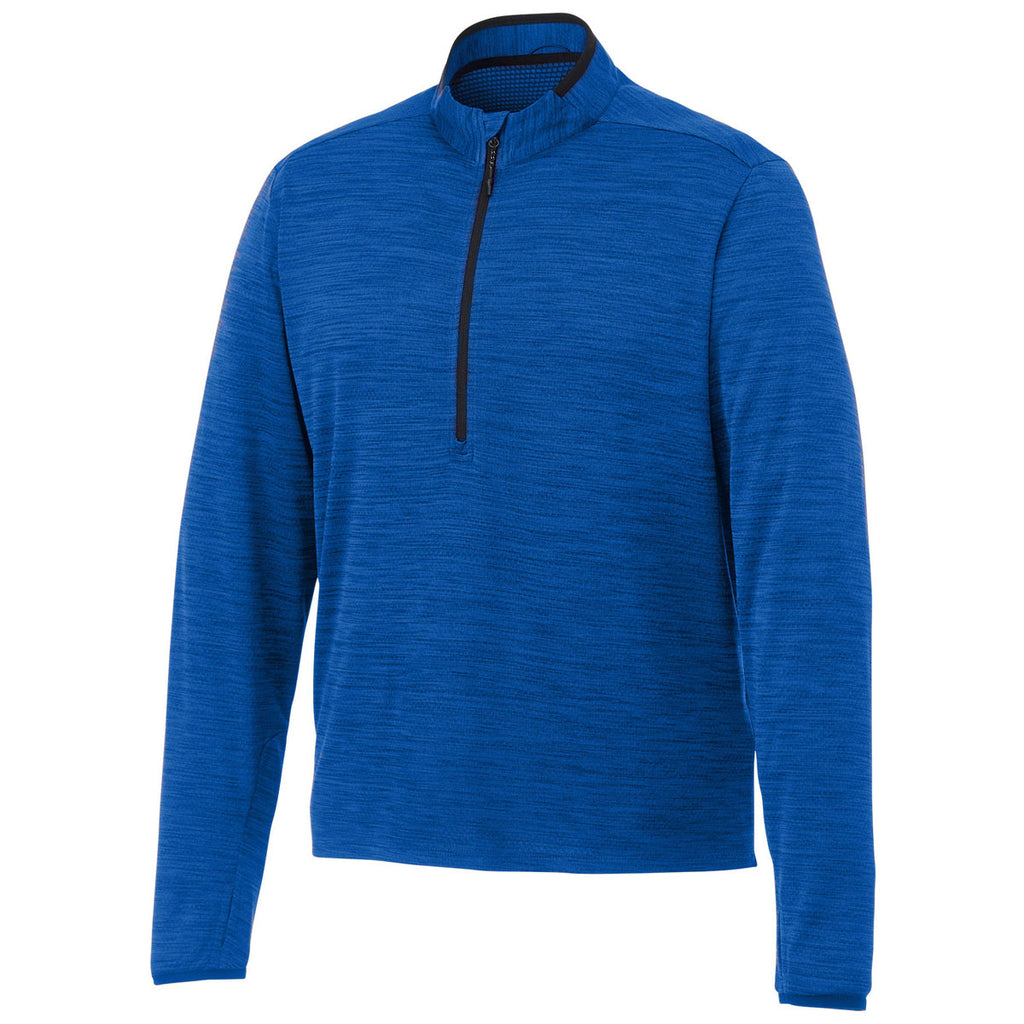 Add a company logo to the Elevate Men's New Royal Heather Mather Knit Half Zip to use as a corporate uniform that is easy to wear and care for while keeping the look professional. Ideal for those who have to work in different homes, this half zip is easy to layer over another shirt while being easily identifiable by clients. The fabric is moisture wicking and breathable to keep you cool and comfortable, but has a chin guard to hold in warmth when the weather is unpredictable. Snag resistance is perfect for daily wear even when moving around or working.Corresponding Women's Style:Elevate Women's New Royal Heather Mather Knit Half Zip