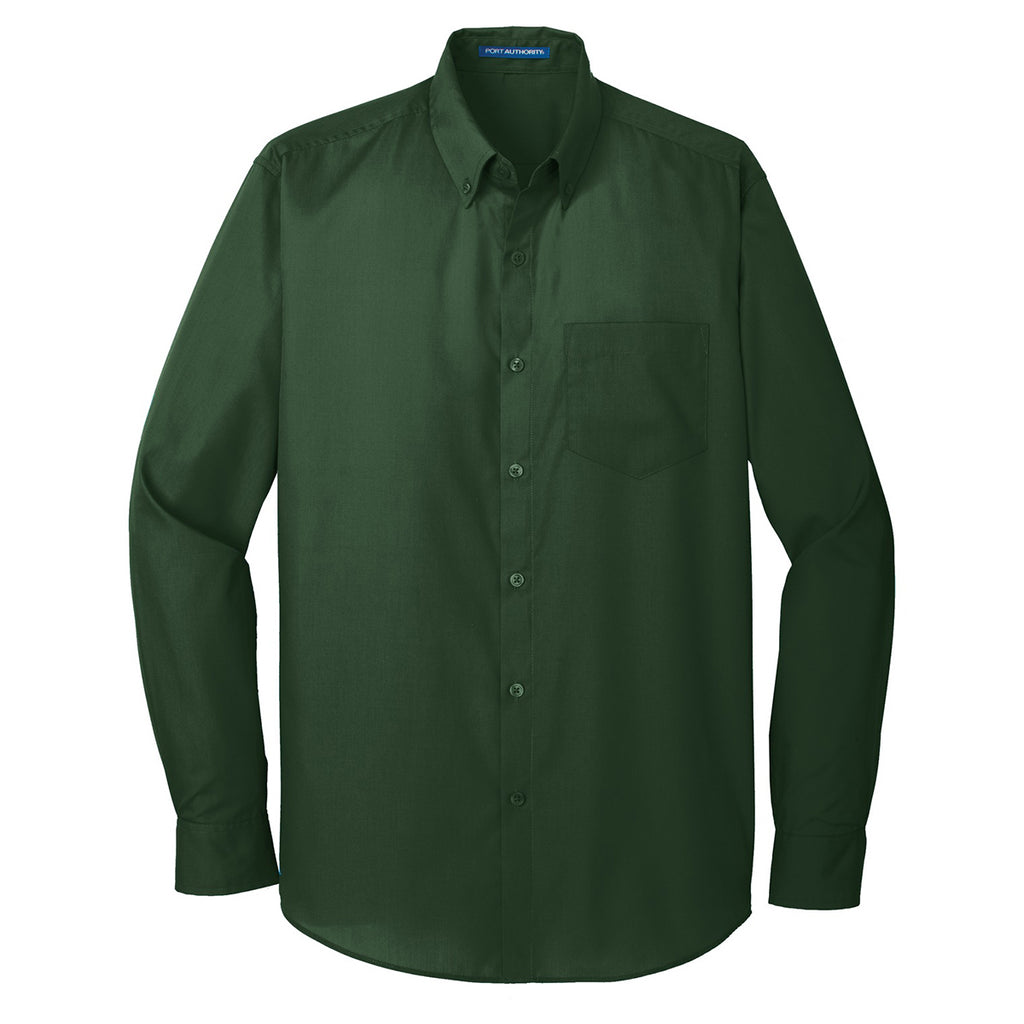 Wear the embroidered Port Authority Men's Deep Forest Green Long Sleeve Carefree Poplin Shirt to the next corporate event or industry trade show. The elegantly design poplin shirt exudes a care free attitude, while still keeping you in the upscale corporate fashion game. Cotton and polyester blended together produces a super soft shirt that withstands the rigors of frequent use. The box back pleat sends a powerful design message that you take how you look among your professional peers seriously. Add a custom logo on the large imprint area to spread the word about your company. Adjustable cuffs allow you to kick back after a long day at the office.Highlights