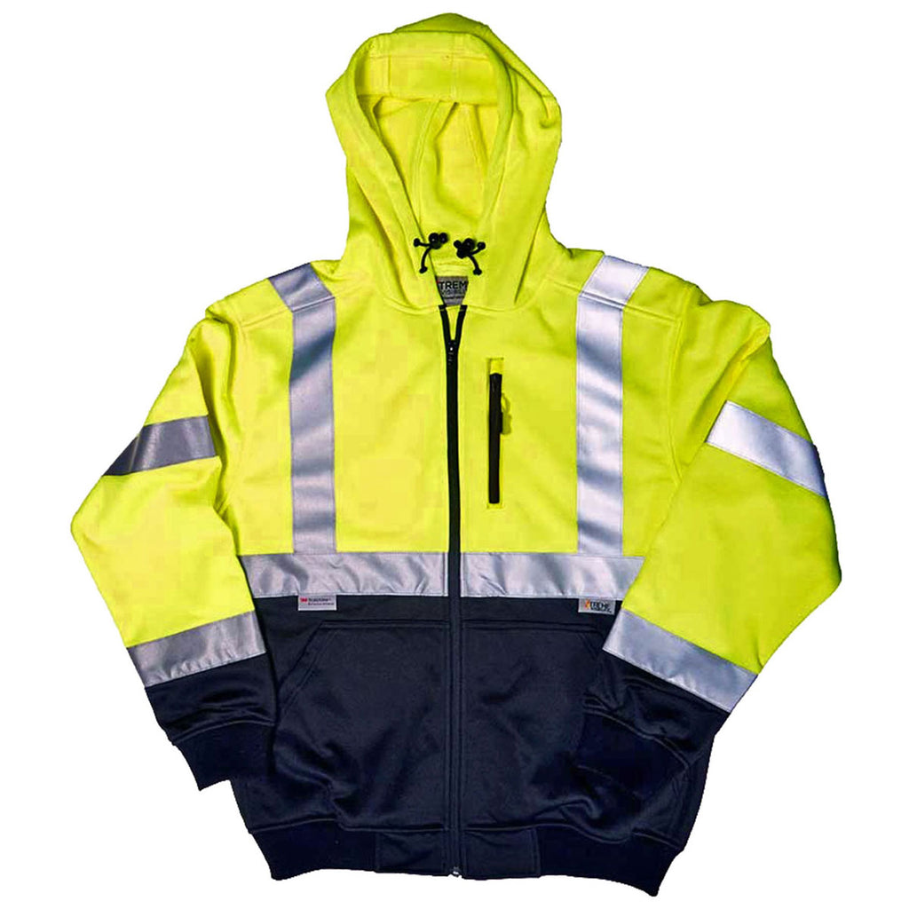 Add a custom logo to the Xtreme Visibility Unisex Yellow HiVis Class 3 Sweatshirt for a fun and functional look on a unique hooded sweatshirt. This high quality, bright safety yellow sweatshirt has a full front zip, reflective tape and black bottom front to mask dirt and stains. The rugged pill resistant polyester fleece is perfect for screen printing to create employee apparel or a unique uniform for your company or organization. The hood offers a hi-tech cord closure for your unique fit and comfort. Place an order today before missing out on these amazing, easy to wear sweatshirts being added to your logoed apparel line.Highlights