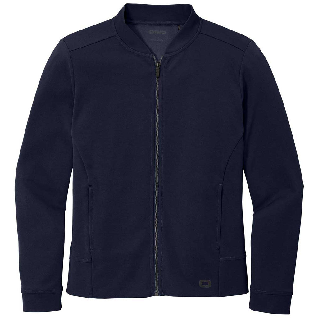 The custom OGIO Women's River Blue Navy Hinge Full-Zip provides a sleek, sexy, modern look that can be appreciated by all. Fashion forward and fully functional, this full zip is perfect for daily wear, but can also serve as gym wear or team gear with the baseball inspired collar, angled back seaming, and full zip front. Easy to layer, this full-zip sits at the hip for a younger look and the subtle texture adds that something extra we all desire. Choose a custom logo or team name to create warm-up gear that team members will beg to wear.
