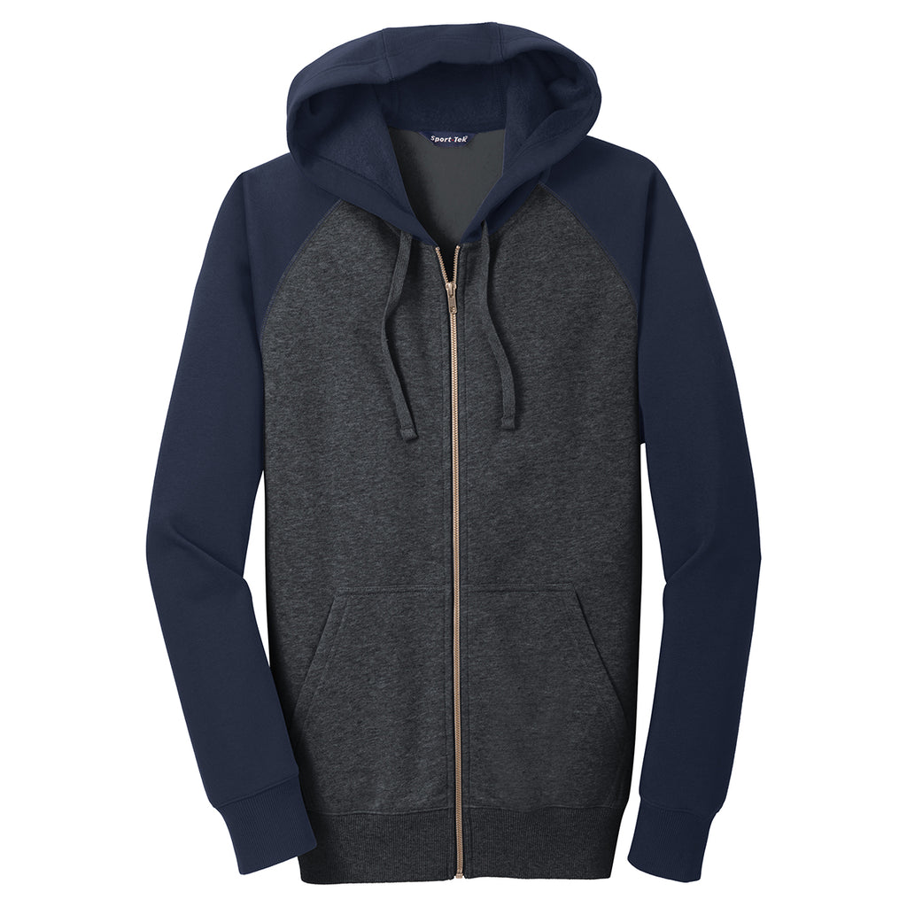 Sport-Tek Men's Graphite Heather/True Navy Raglan Colorblock Full-Zip Hooded Fleece Jacket