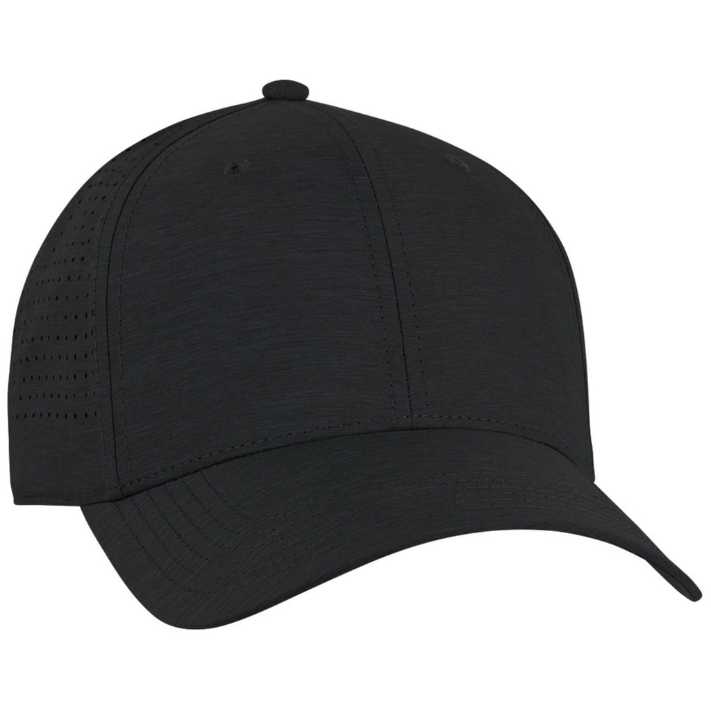 Create a corporate logo for the Ahead Black Heather Brezo Performance Cap made of heathered perforated fabric with a silicone hook and loop closure. This trendy cap is structured with a mid-fit and pre-curved visor to keep you cool and protected whether you are chilling in the stands, playing your favorite sport, or just relaxing while running errands.The minimum order for this product is 25 pieces.