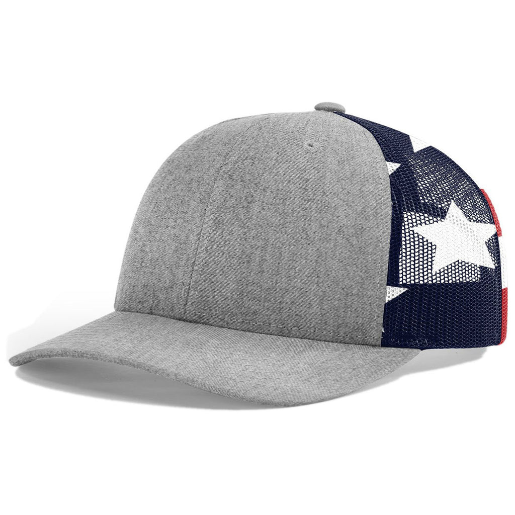 Keep your head protected and logos exposed on outdoor events with this customizable Richardson Heather Grey/Stars & Stripes Printed Mesh Trucker Hat. Advertise your team mascot or company's message on the front of this item to make it a promotion to remember. Top off summertime looks or hide a crazy hair day while shading your face from the sun with this classic trucker hat designed with an adjustable back strap for custom fit. It boasts a classic trucker design and a mesh in the back brings a breezy comfort and offers superior airflow.The minimum order for this product is 48 pieces.