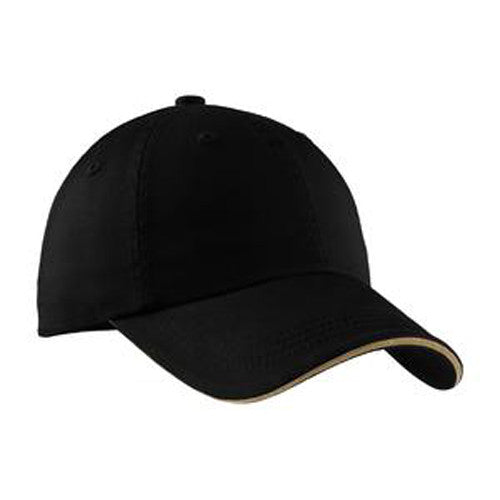 What makes a hat great? Well, it depends on the use. Create some great branded apparel out of this Port Authority Black/Khaki Sandwich Bill Cap with Striped Closure with our custom embroidery process and use this headwear for gifts, employee uniforms, giveaways, and much, much more. If only every piece of active wear could be this versatile.Highlights