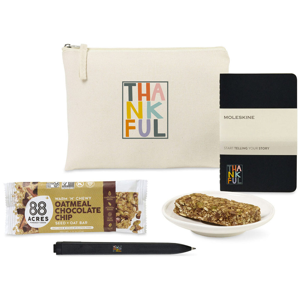 - Whether it's for a meeting, room drop, or welcoming a new hire, this set includes a compact notebook, a pen, and a snack, providing essentail tools and a boost of energy for any professional occasion