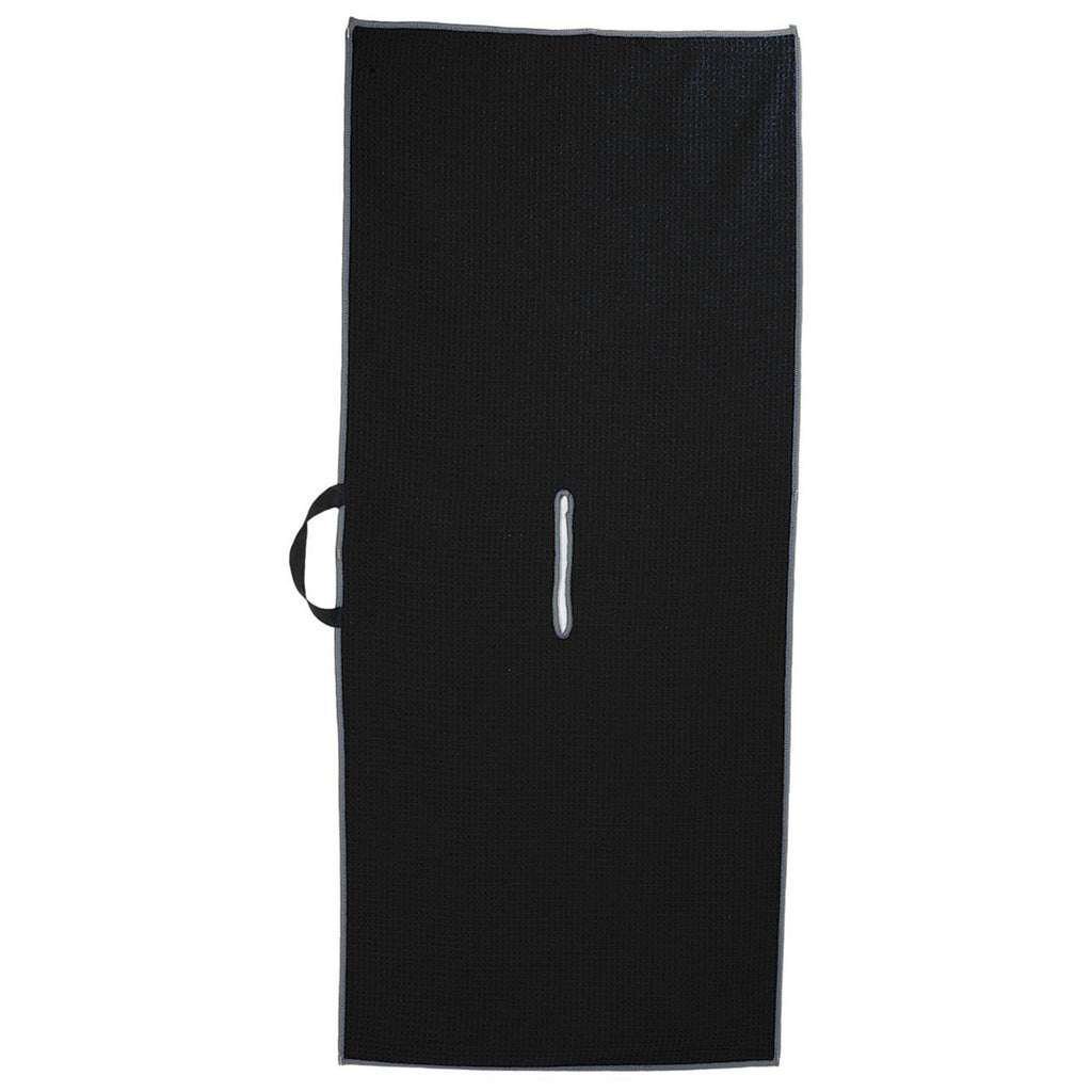Add a custom logo to the Leed's Black 17" x 40" RPET Slip-Over Players Towel with a waffle texture and soft hand feel. The highly absorbent towel is great for cleaning, and a large center slit easily fits over the clubs to save space. Perfect for cleaning before and after a shot or an entire round. Sell in a pro shop or specialty shop with ease.The minimum order for this product is 50 pieces.