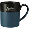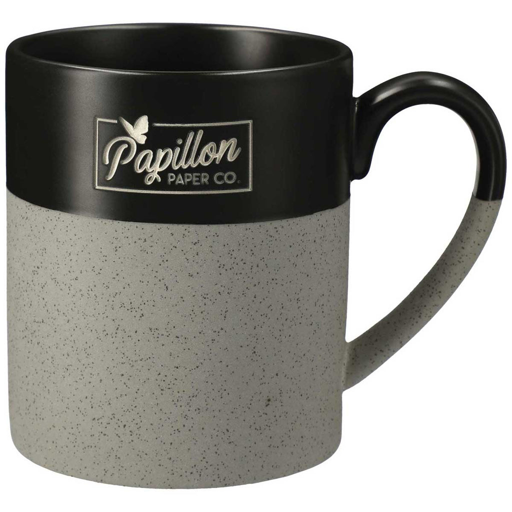- Two-tone ceramic mug with speckled appearance on bottom and black glazed top