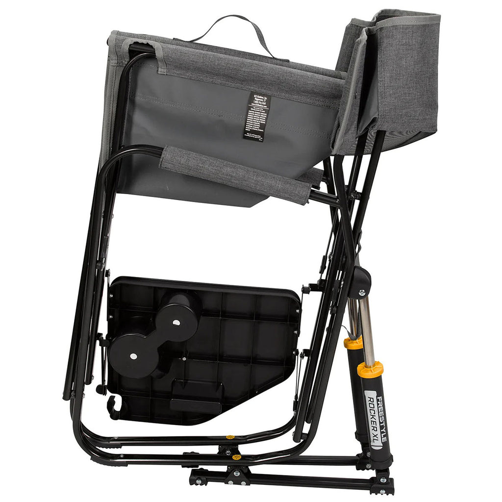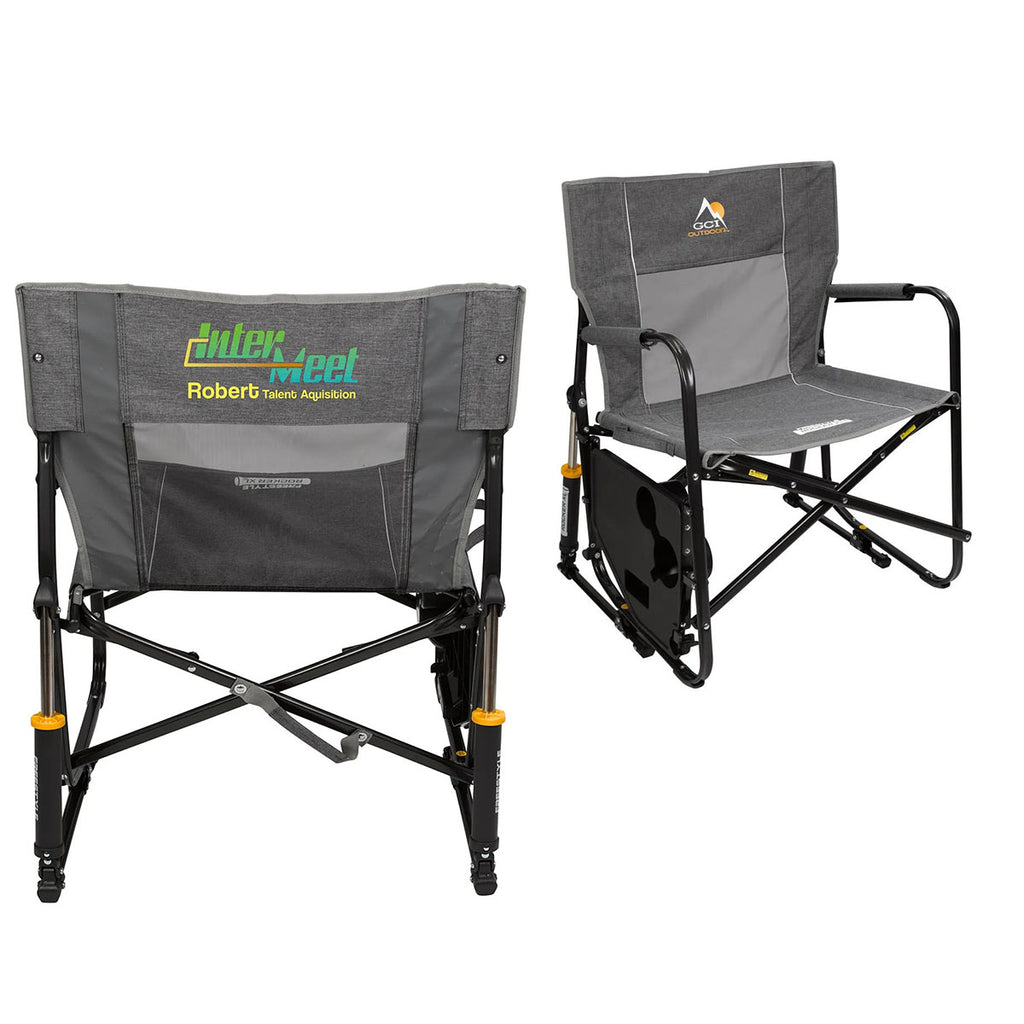 The custom GCI Outdoor Grey Freestyle Rocker XL with Side Table is designed for comfort and convenience. Featuring a smooth rocking motion and a built-in side table, it's perfect for outdoor events, tailgating, or relaxing in the backyard. The XL size offers extra space, while the sturdy frame ensures durability for long-lasting use.The minimum order for this product is 6 pieces.
