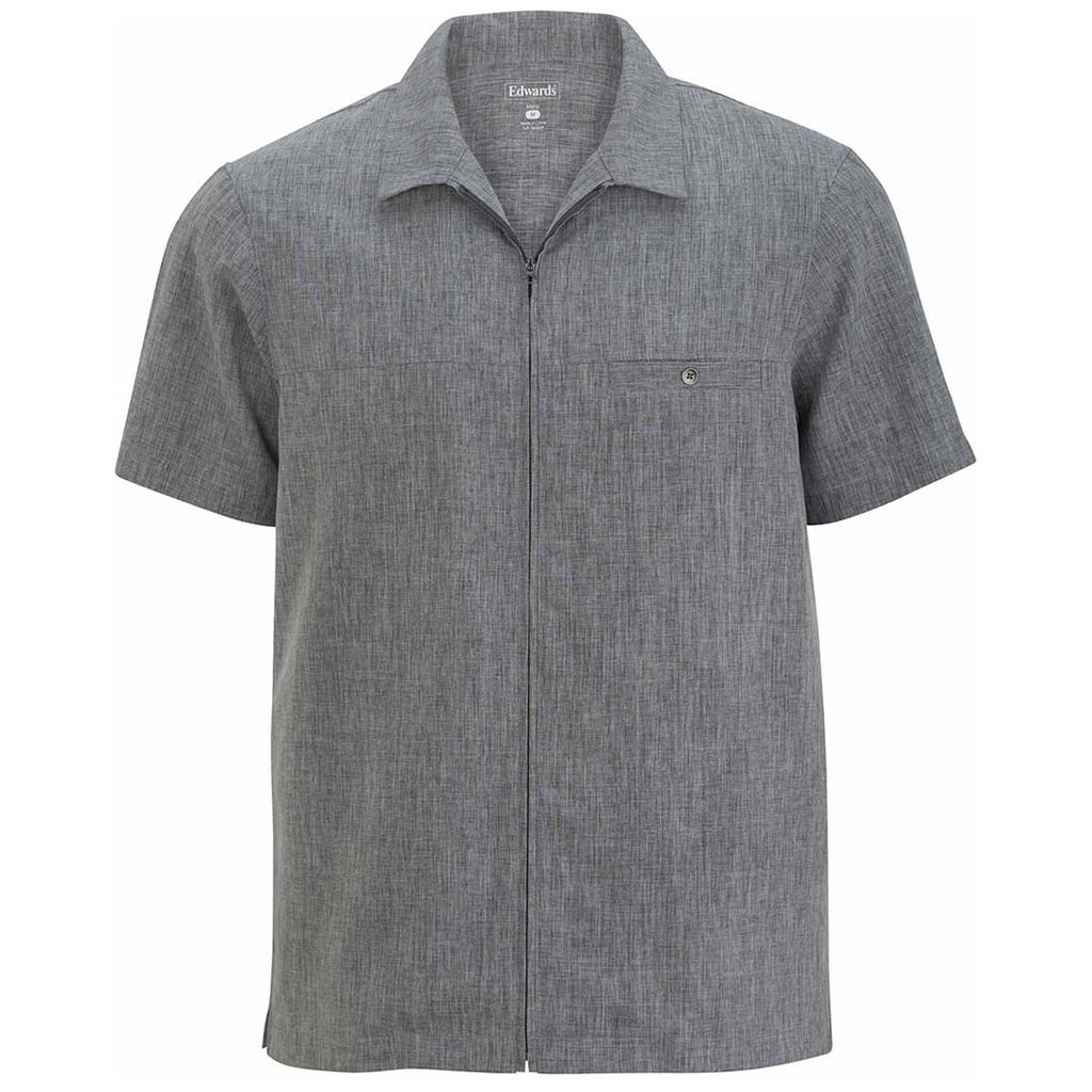 Edwards Men's Black Heather Melange Ultra-Light Chambray Service Shirt with a corporate logo creates a sleek design that can serve as a uniform or personal wear with ease. The Scotchguard finish and soil release properties make this great for healthcare workers, housekeeping, or spa workers. Place an order right away.Highlights