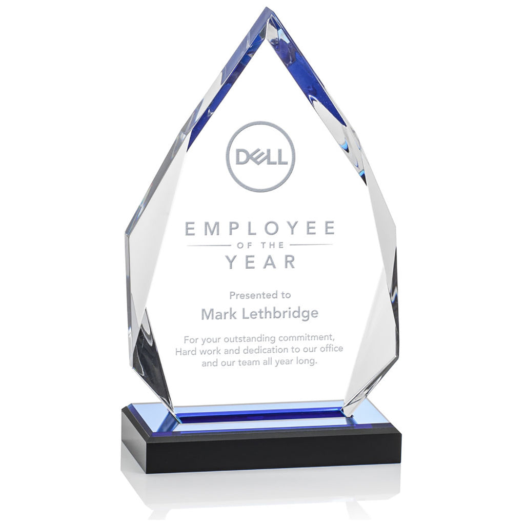 The St. Regis Blue Beckenham Award 5.25" x 8.75" with Standard Base - Laser Engraved with a custom or corporate logo is a wonderful way to recognize a special achievement or goal. The gorgeous ebony base with a golden reflective top radiates gold through the interchanging facets toward the peak. Perfect for employment anniversaries, outstanding service, and top marks.The minimum order for this product is 1 piece.