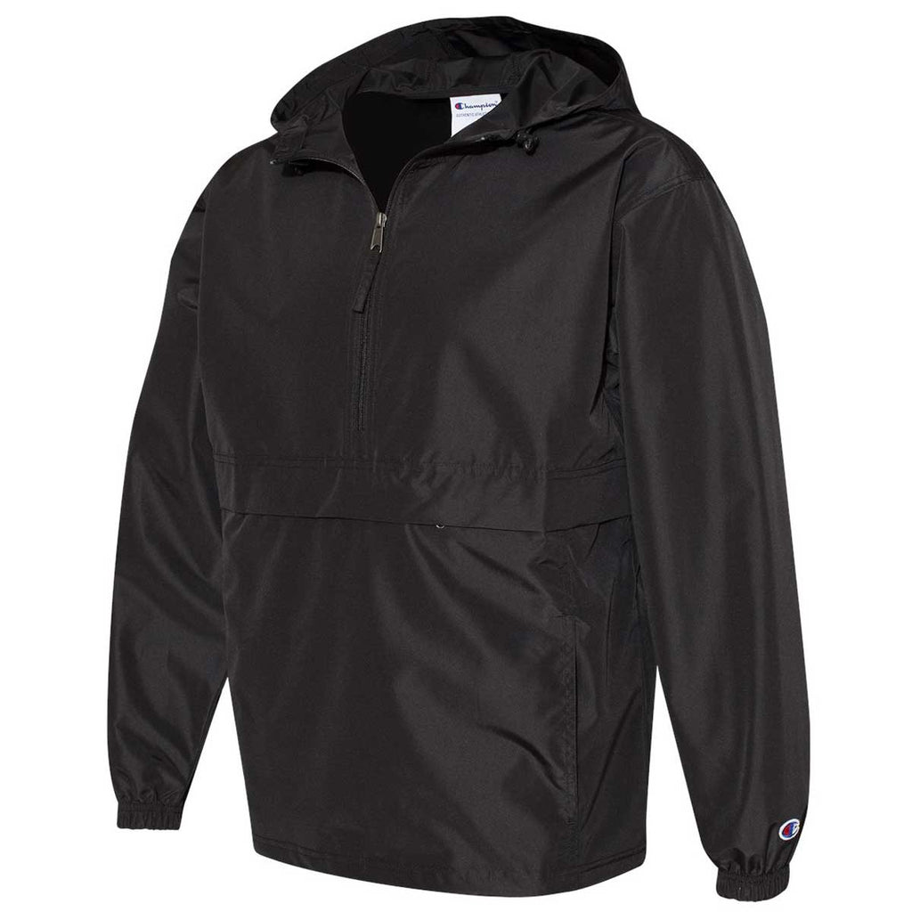 Convenience is key with the custom Champion Men's Black Packable Jacket made of 100% polyester micro poplin. The wind and water resistance will come in handy when the weather takes an unexpected turn during the day. Perfect as part of employee apparel with custom embroidery added to fit your needs, this packable jacket comes with a mesh lined storage bag. The half zip hood offers an adjustable bungie cord for easy to wear comfort and the encased cuffs and waist drawcord means a great fit even when the rain hits hard. Encased elastic cuffs keep your clothing dry no matter your activity. Add a corporate logo and use this as part of athletic apparel for pregame warm-ups and rain delays.