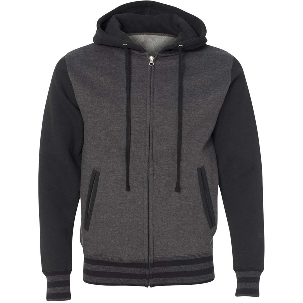 Be head of the class with a corporate embroidered Independent Trading Co. Unisex Charcoal Heather/Black Varsity Hooded Full-Zip Sweatshirt in six color combinations. The cotton polyester blend 3-end fleece offers a unique, yet comfortable look that will have you reminiscing about the good old days in no time. Perfect for a youthful look with a company logo being used as employee apparel or just to customize and use as employee gifts. The slim unisex fit is both fashionable and functional in this varsity creation. The signature stripping around the cuff and hem and coordinating color hood add to the overall look.Highlights