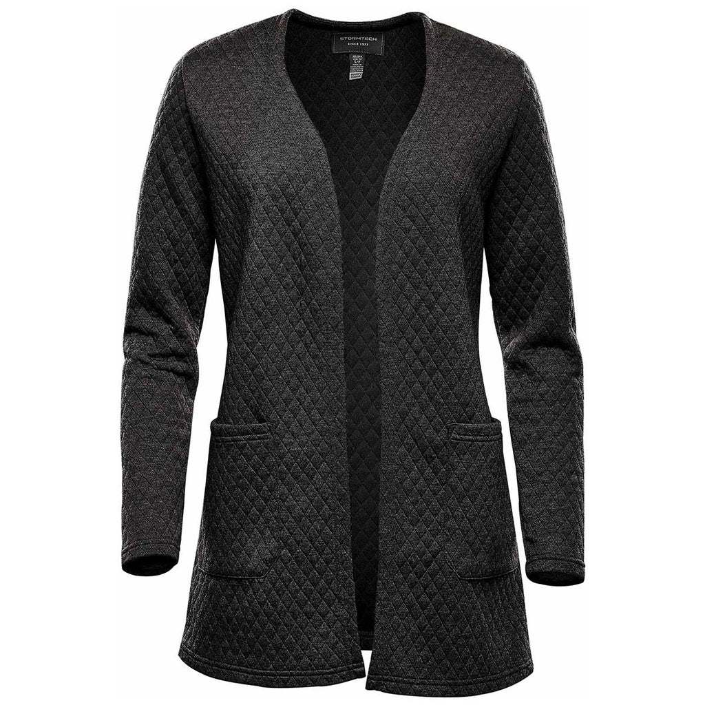 Show your custom style with the Stormtech Women's Black Chelsea Open Cardigan. Add a company logo to the versatile cardigan to use as employee apparel or to offer an option in cold weather. The 3/4 length cardigan is on trend with the urban scene, but highly functional when it comes to warmth. The quilted pattern with side pouch pockets add to both form and functionality in this open cardigan that will be an instant hit.Highlights