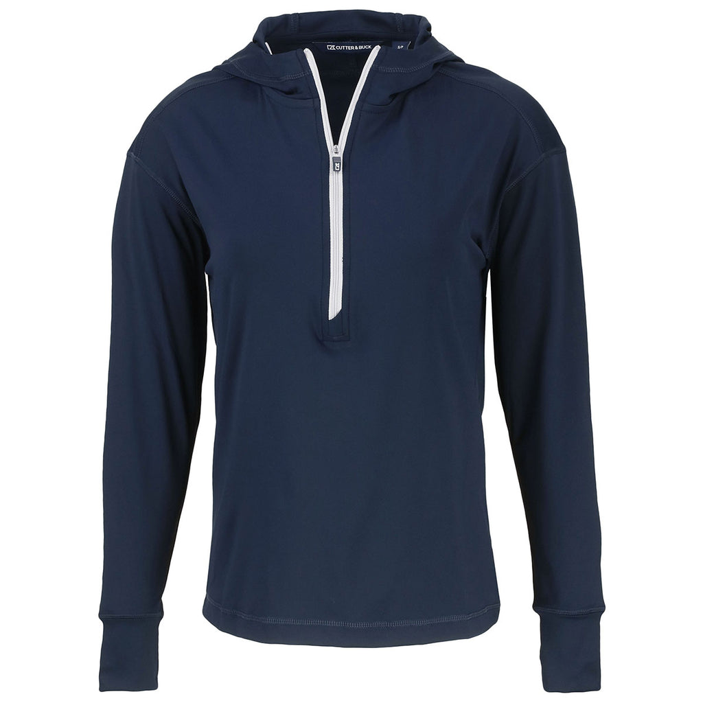Cutter & Buck Women's Navy Blue Daybreak Eco Recycled Half Zip Hoodie with a custom logo is a fun and functional way to be ready for activity. The half zip is an easy top layer when heading out for a morning run, to work out, or to take a yoga class. An attached hood makes this piece even more versatile. Place an order today.Highlights
