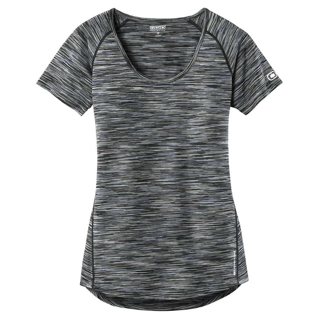 When it comes to fashionable corporate shirts, the custom printed OGIO Endurance Women's Blacktop Space Dye Verge Scoop Neck leads the way. Reflective details make the tee perfect for women who like to jog or ride their bicycles at night. Flat lock seams ensure maximum comfort, while increasing the strength of the 100% polyester jersey fabric. Instead of dealing with a tag that itches the back and shoulder, the scoop neck tee includes an Endurance heat transfer label etched into the fabric. Add your corporate logo on the tee to increase the recognition of your company at professional networking events.