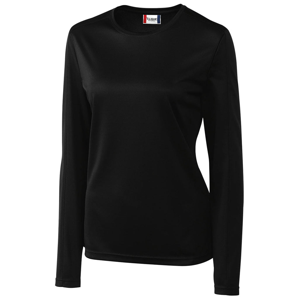 The Clique Women's Black Long Sleeve Ice Tee offers casual comfort that's sure to be a favorite in your closet. With your company logo added to the shirt in screen print, you can make this shirt even better by adding an advertising component to it. This women's long-sleeve shirt comes in a variety of vibrant colors and offers many wonderful features including a cozy 100% polyester mesh material, double layer neck trim, pieced shoulders and sleeves, fully taped neck seam, and moisture wicking components. Buy this item to hand out at your upcoming corporate events, including trade shows, recruiting events, and more.Corresponding Men's Style:Clique Men's Black Long Sleeve Ice Tee