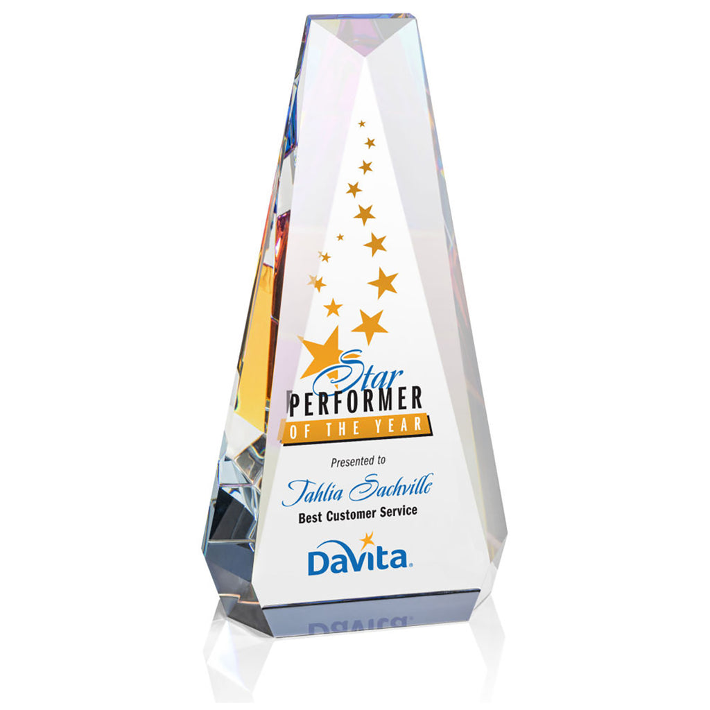 - The multi-color base reflects a brilliant rainbow of colors throughout the dynamic bevels of the award.