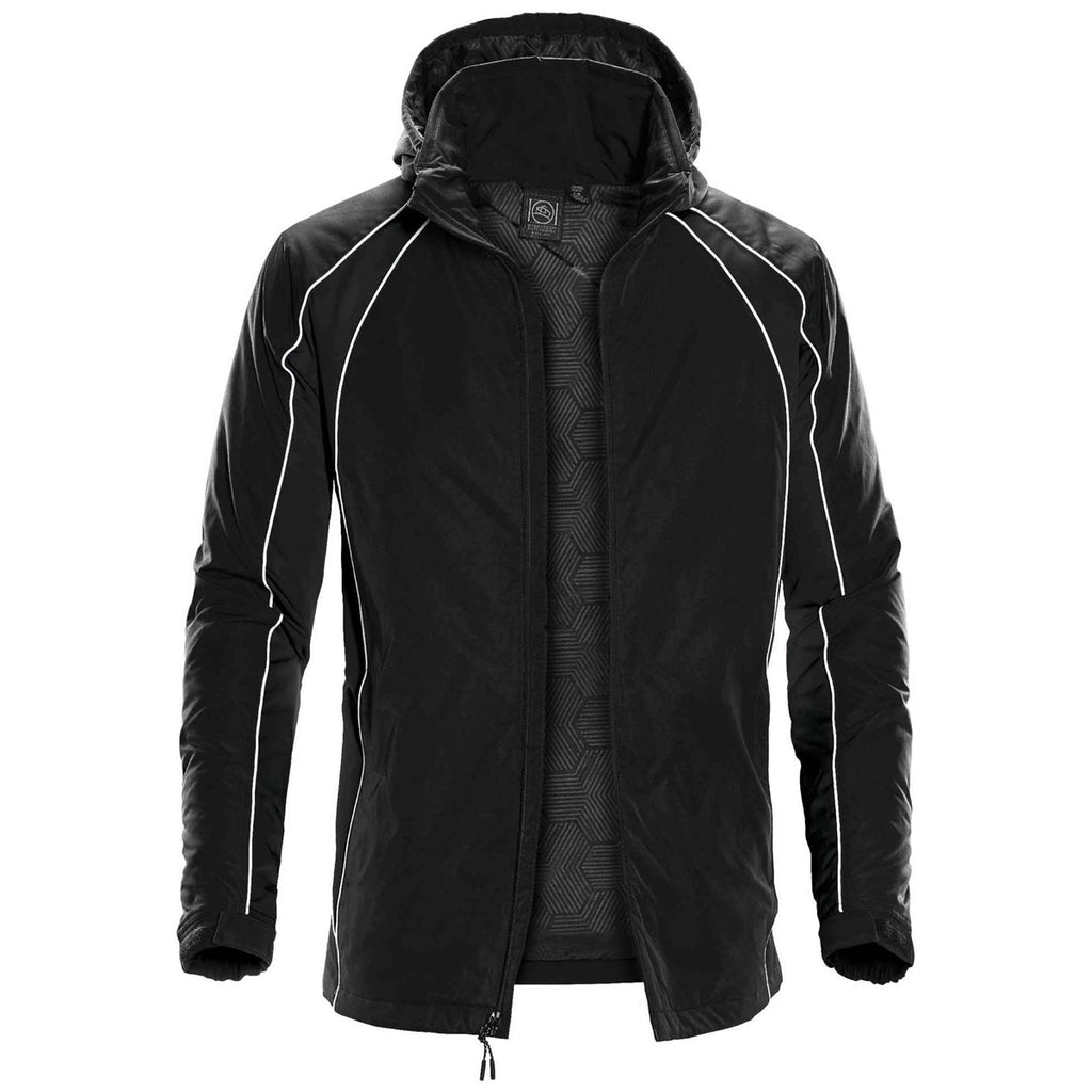 The Stormtech Men's Black/Black Road Warrior Thermal Shell Jacket is the cold weather staple that your team will be wearing for years to come. The durable polyester micro twill shell offers breathable water resistance and articulated elbows that will hold up to everyday wear. The inner lining features THERMALSHELL technology, with thermal insulation along with heat reflecting print to retain and regulate body heat. Perfect for employee apparel, this jacket has room at the chest for a custom logo, and a hood that can be stowed based on the wearer's preference. Finished with adjustable cuffs and hem for a perfect fit, this is a great option for corporate gifts.Corresponding Women's Style: Stormtech Women's Black/Black Road Warrior Thermal Shell