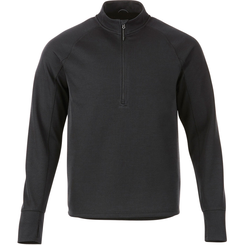 Elevate Men's Black Crane Knit Half Zip is on point to hit the woods for a hike, take an early morning run, or enjoy a casual meeting with new clients, even if cold weather is in full force. Business casual has hit a new high with the 100% polyester double-knit sweater in maroon heather, invictus heather, heather charcoal, or black. Add your custom logo and offer this half zip knit as a corporate gift or employee apparel for those who need to look their best. The snag resistant, moisture wicking finish is great for team building activities happening outdoors with sleeve cuffs and thumb exits for added warmth. Once removed the knit can be easily hung with the hanger loop.Corresponding Women's Style:Elevate Women's Black Crane Knit Half Zip