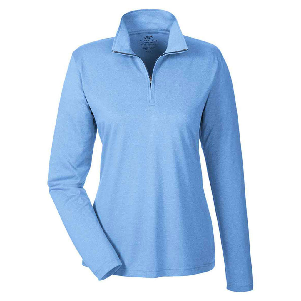 The first time you put on the UltraClub Women's Columbia Blue Heather Cool & Dry Heathered Performance Quarter-Zip you know you have hit a home run in the fashion department. Smooth 100% heathered polyester never snags to prevent unsightly rips and tears from diminishing the appearance of the chic quarter-zip. Enjoy moisture wicking technology that evaporates sweat to dry the skin. The tag less quarter zip includes back neck tape to create a clean design finish. Slide the center front coil zipper effortlessly to close the quarter-zip when the wind picks up. Add your company logo on the large imprint area for getting the word out about your brand.Corresponding Men's Style:UltraClub Men's Columbia Blue Heather Cool & Dry Heathered Performance Quarter-Zip