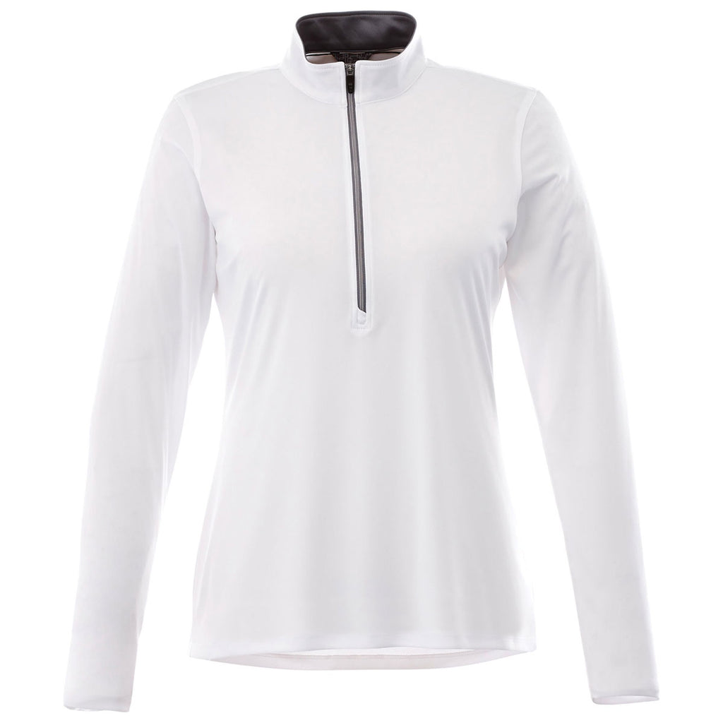 The Elevate Women's White Vega Tech Half Zip with your custom logo is a perfect gift for your loyal female employees. It has a stylish professional look and it features a lightweight breathable but moisture wicking fabric. This fabric has UV protection and resists snagging so it is ideal for sunny days. This piece of wardrobe is designed for wash-and-wear convenience and therefore makes a perfect gift for every modern woman. Because of its versatile look, your employees will gladly wear it not only for corporate events but during their everyday activities. Let your employees know they are appreciated with this half zip.Corresponding Men's Style:Elevate Men's White Vega Tech Quarter Zip