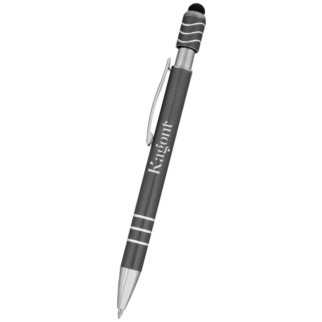 Enjoy a custom design on the Hit Metallic Gey Spin Top Pen With Stylus. This plunger action aluminum pen has a spin top to combat boredom while at work or school and a stylus on top for computer-based work or texts. These are perfect for those with focus issues or ADHD. Order enough to outfit your classroom, office, or home for the foreseeable future.