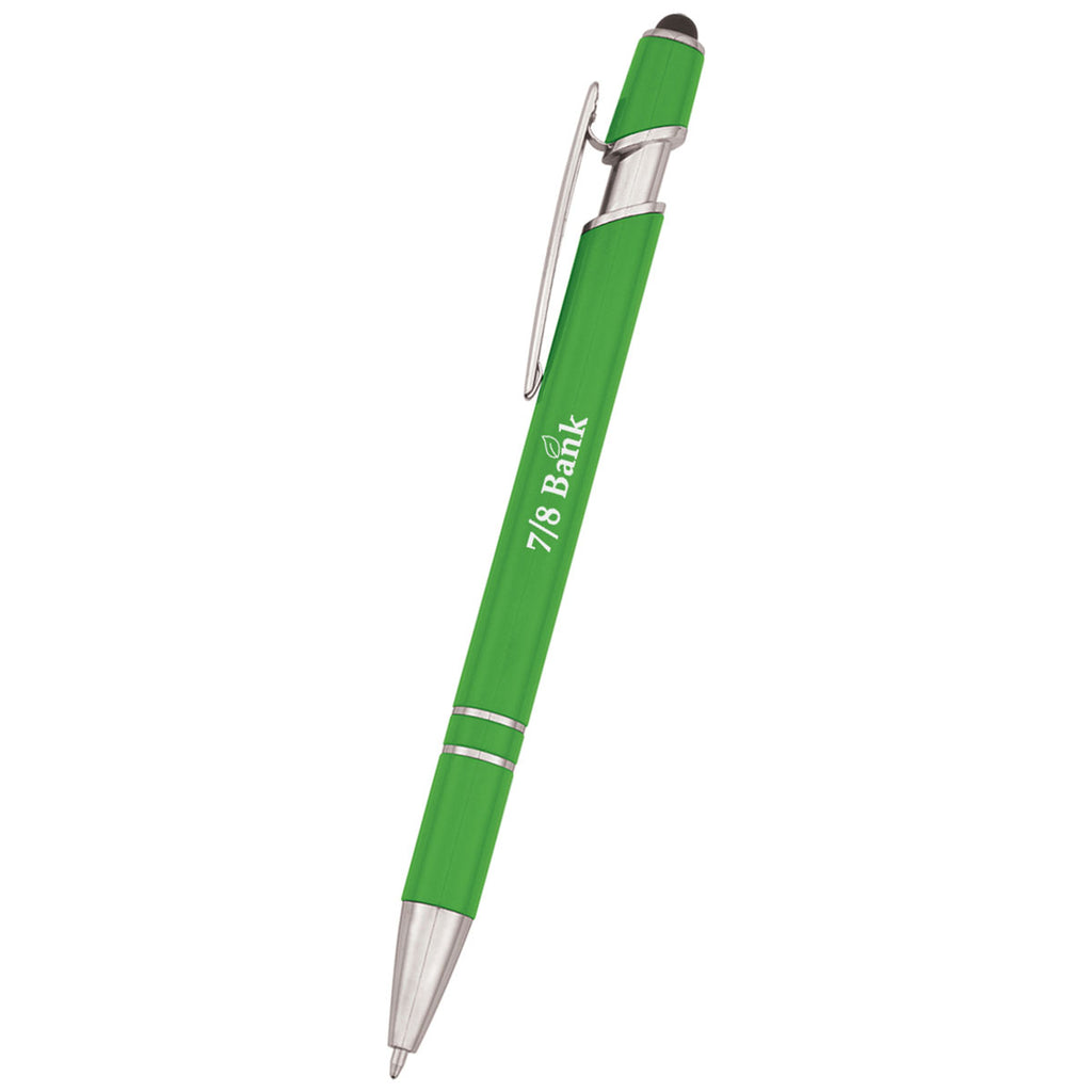 Hit Neon Green Roslin Incline Stylus Pen with your custom logo is a simple and economical way to share your brand or message. Available in a range of colors, this stylus pen is clickable and has smooth writing. You can easily take notes and then flip it around to use the stylus on your iPad or screen. Great for the office, home, or anywhere you need to be productive.