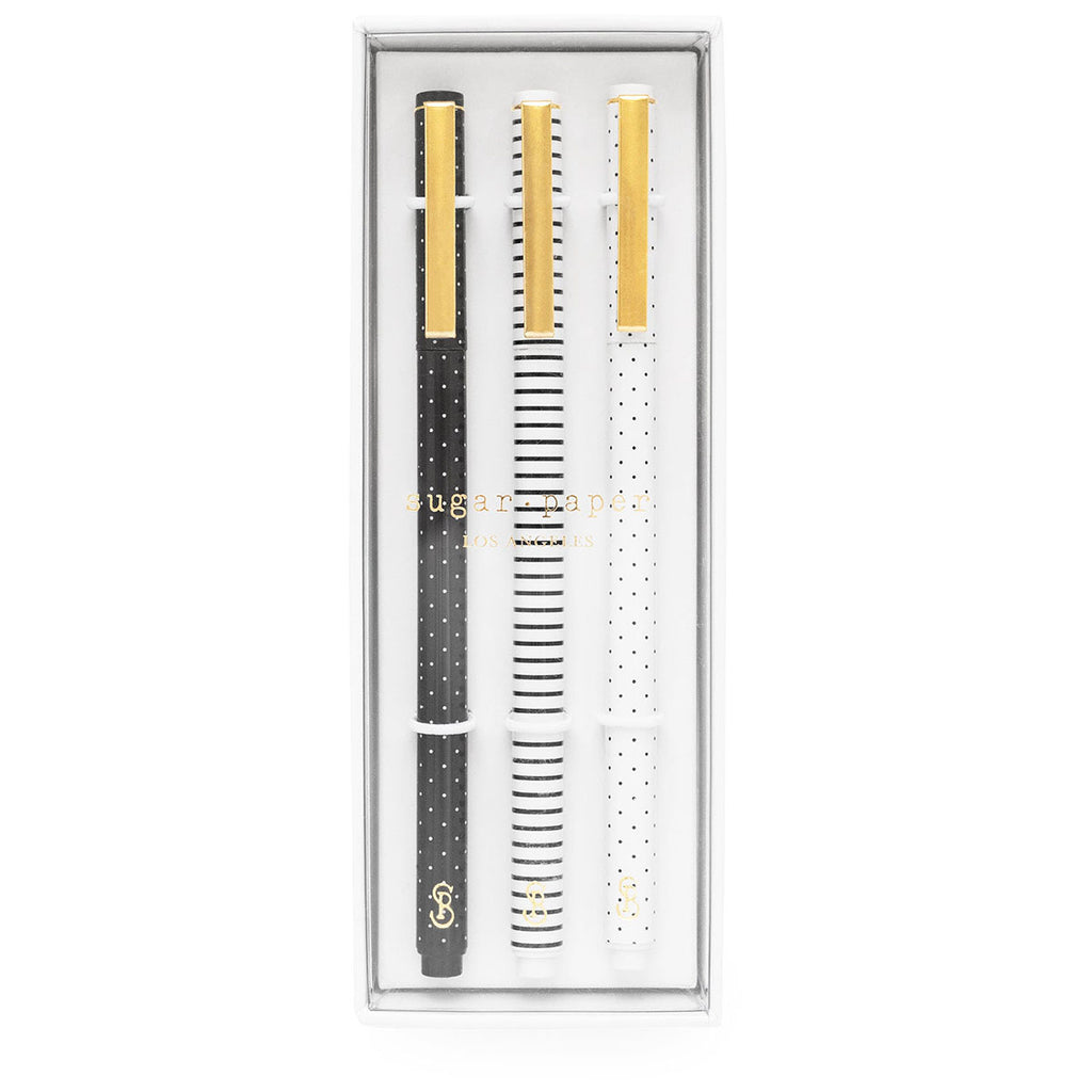 Give your team a branded gift they'll have use for by adding your company's custom logo or design to the Sugar Paper The Stripey Felt Pen Set (Set of 3). A trio of attractive patterns make this stylish pen set an elegant addition to any desk or office space. Sleek black ink and a smooth barrel design makes them incredibly easy to write with.The minimum is 3 units.